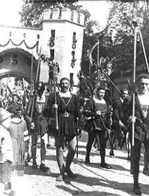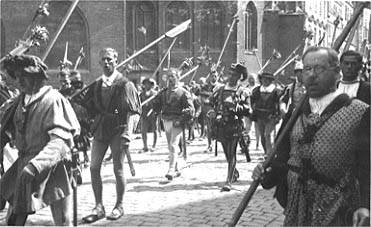Landsknechte waren bei allen Aufführungen der "Landshuter Hochzeit" dabei, auch wenn sie im Laufe der Jahre ihr Aussehen und ihre Ausstattung bzw. Bewaffnung mehr den historischen Gegebenheiten angepaßt haben. |